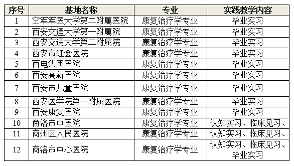商洛学院高度重视康复治疗学专业建设,近年来通过积极争取各类项目支持,高标准建设了康复治疗学实训中心,包括康复运动实训室、作业治疗实训室、言语治疗实训室、康复评定实训室、康复诊断实训室、虚拟仿真实训室等专业实训室。先后在西安交通大学第一、第二附属医院,空军军医大学第二附属医院、西安市红会医院、西安高新医院、商洛市中心医院等具有较强专业影响力的医疗机构建立实践教学基地,保障实践教学顺利进行和人才培养质量不断提升。